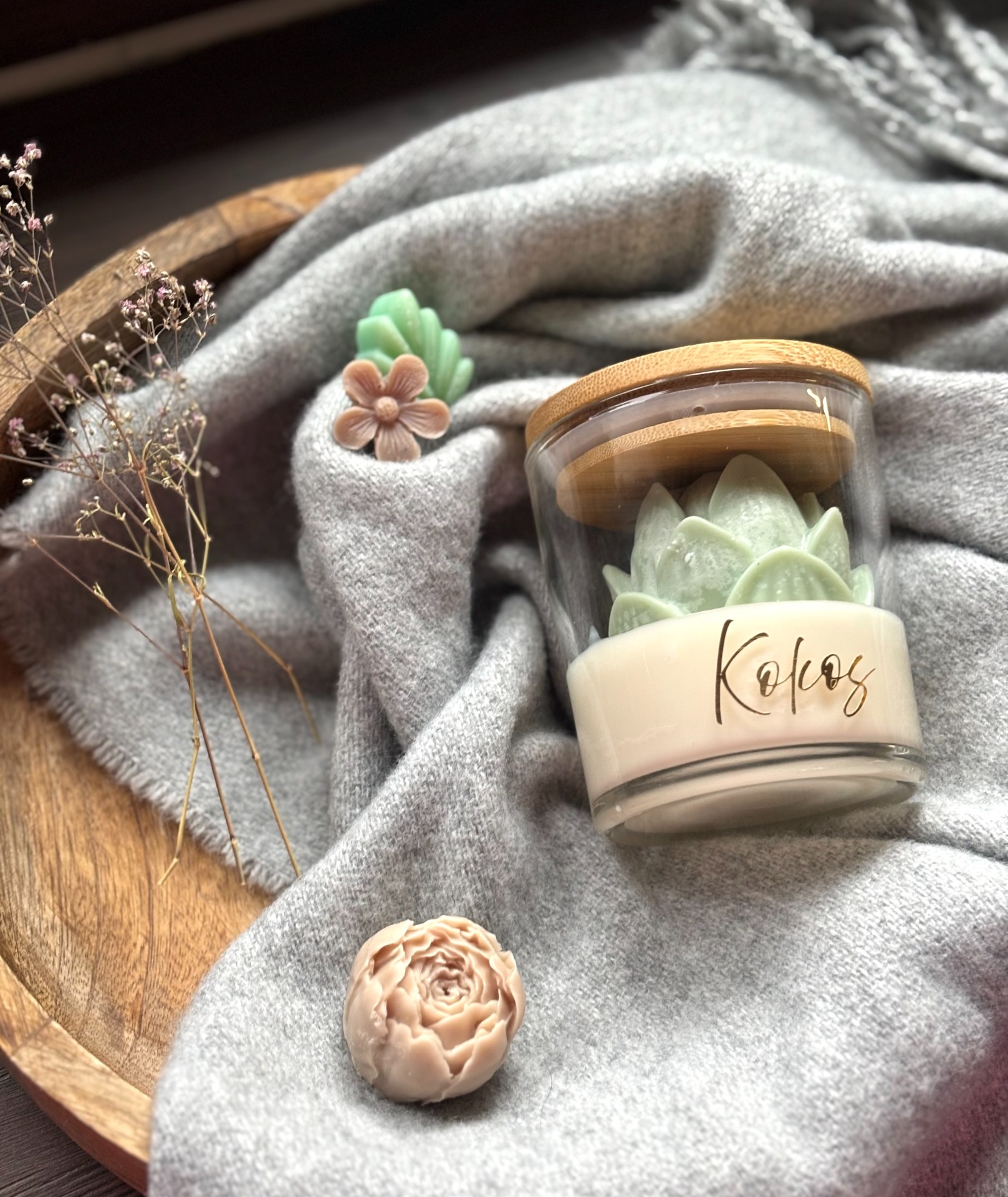 Ručně vyráběná svíčka KOKOS. Lehká vůně - ( kokos, fík, hnědé máslo, cedrové dřevo )