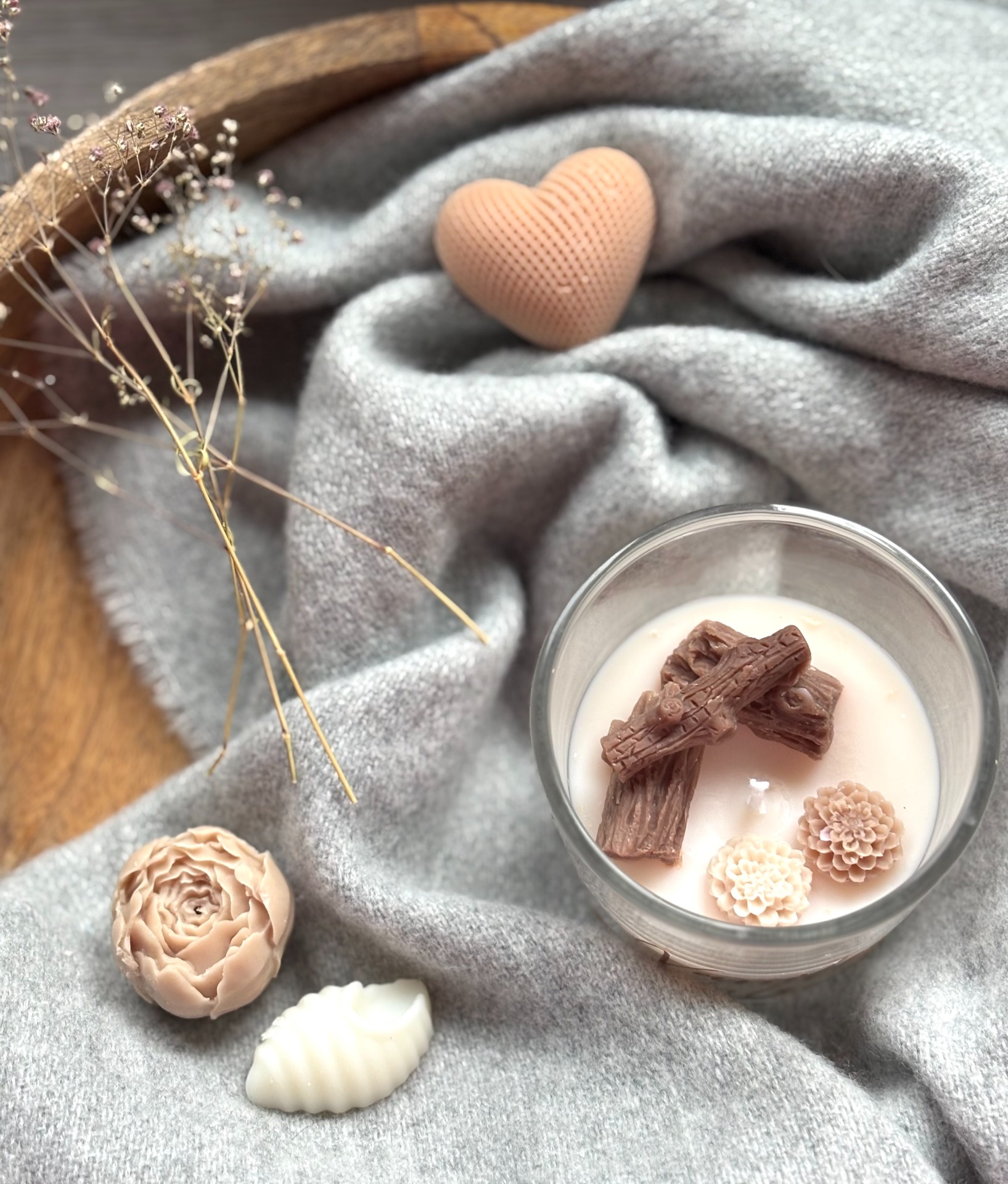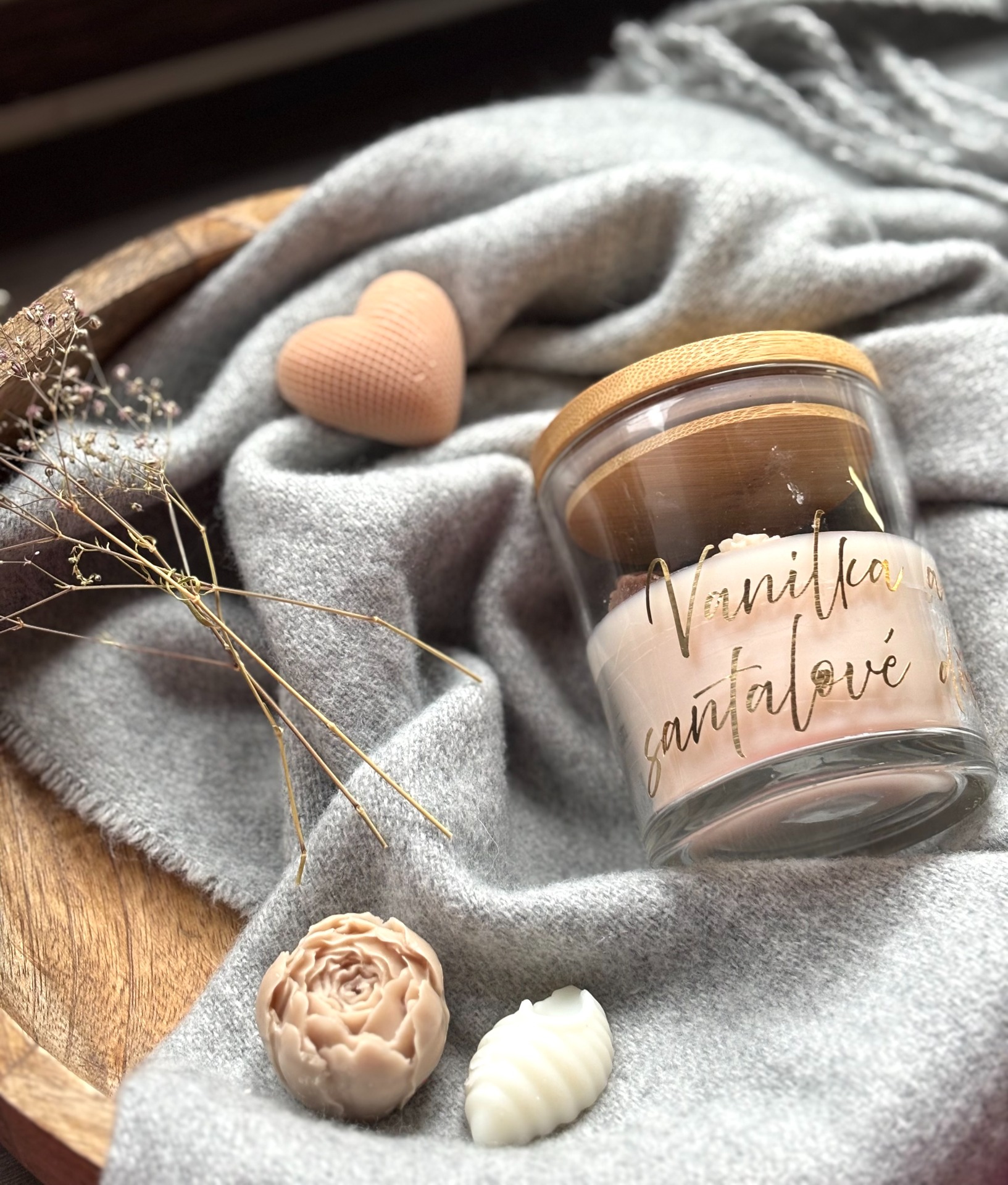 Ručně vyráběná svíčka VANILKA A SANTALOVÉ DŘEVO. Lehce dřevitá a sladká vůně - ( tonka fazole, zimolez, růžové dřevo, vanilka )